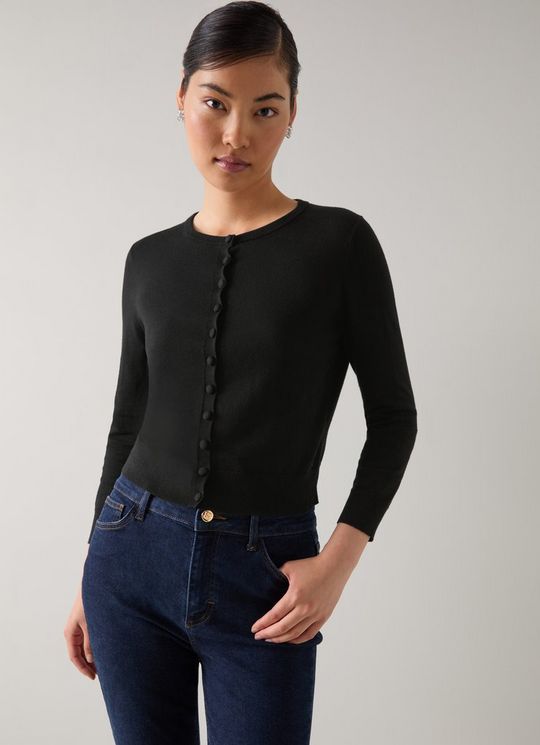 Lottie Black Plain Merino Cotton Fine Gauge Cardigan
