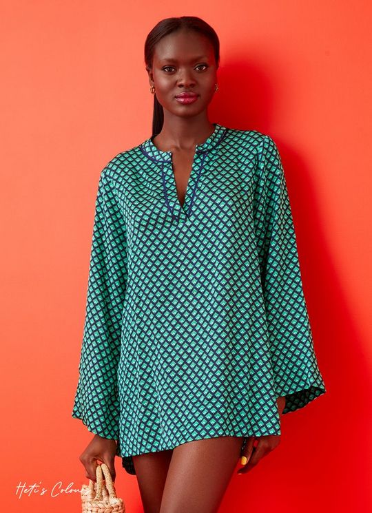 Lucia Green and Navy Geometric Print Kaftan Top