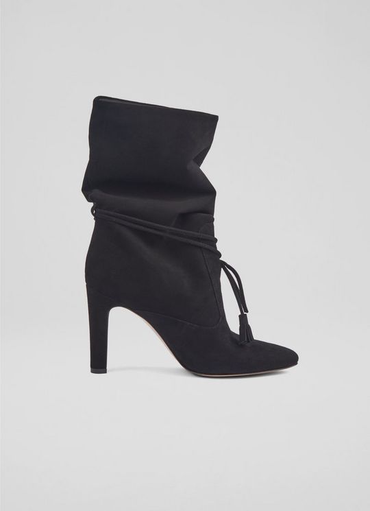 Eliza Black Tassel Ruched Suede Ankle Boots