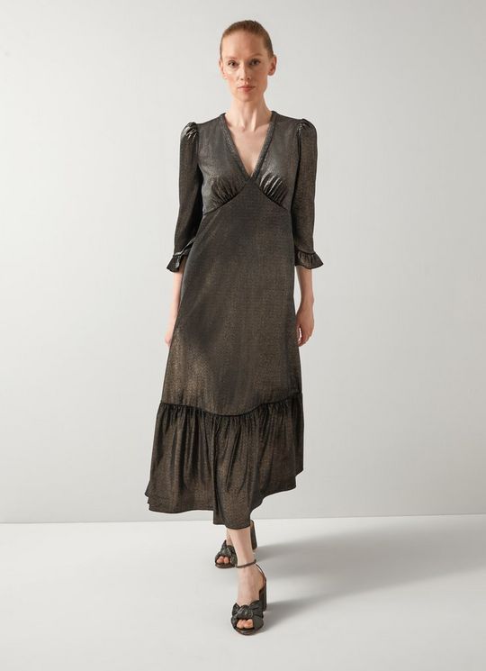 Deborah Black & Gold V-Neck Maxi Dress With Peplum And Frill Cufff